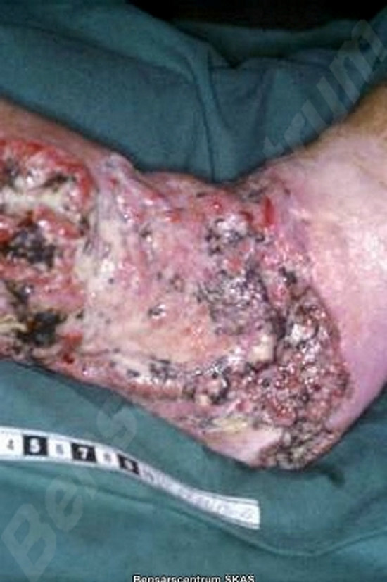 Basalcellscancer är vanligast (basaliom). Sår på grund av melanom eller skivepitelcancer är mindre vanliga.